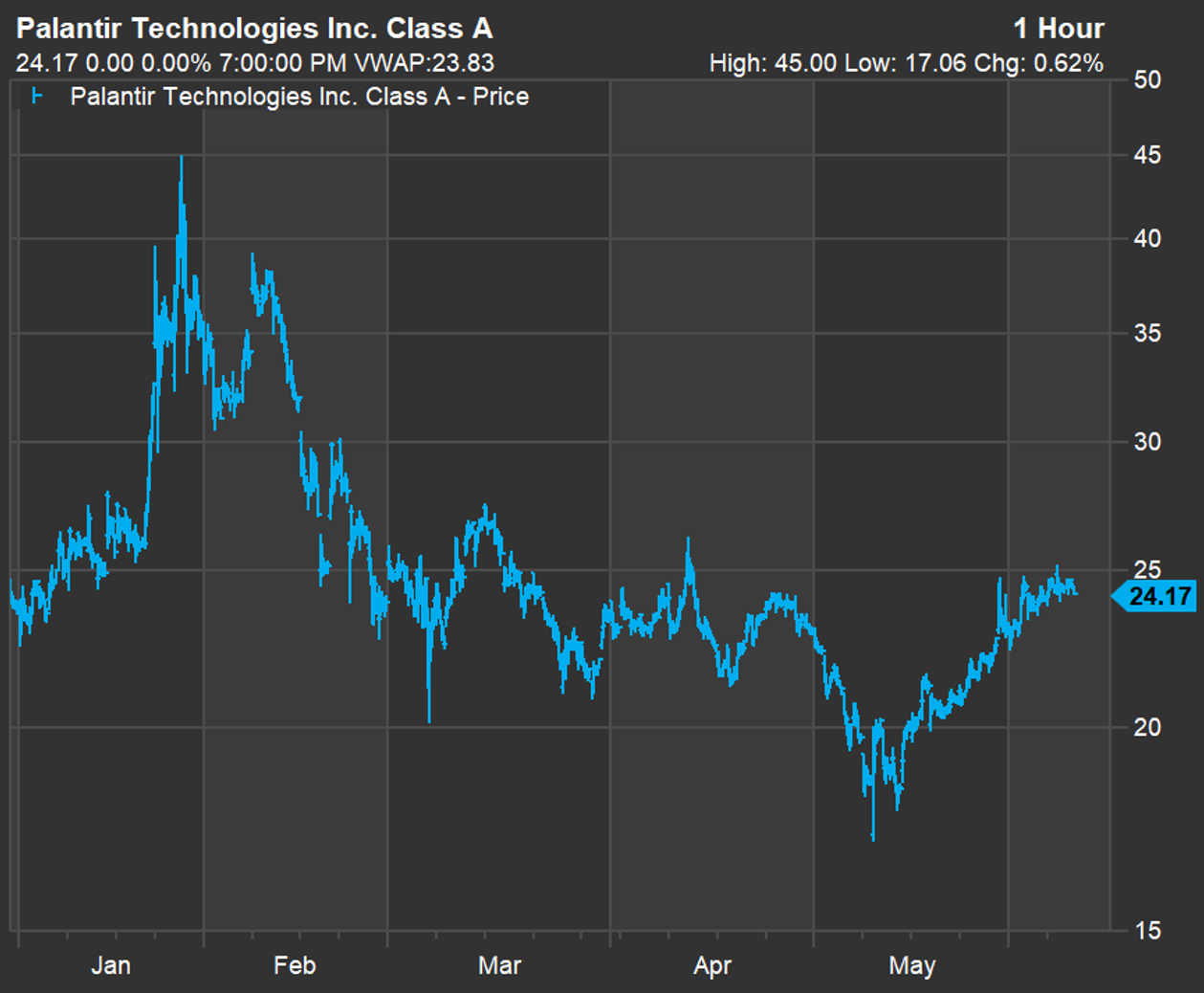 Palantir Technologies Inc. (PLTR) provides a software platform used by government defense and intelligence agencies. It is the largest company on the list by market cap, but not by revenue, as you can see below. A year-to-date chart of its price performance shows how wild the meme-stock action can be: