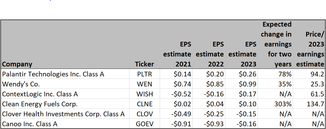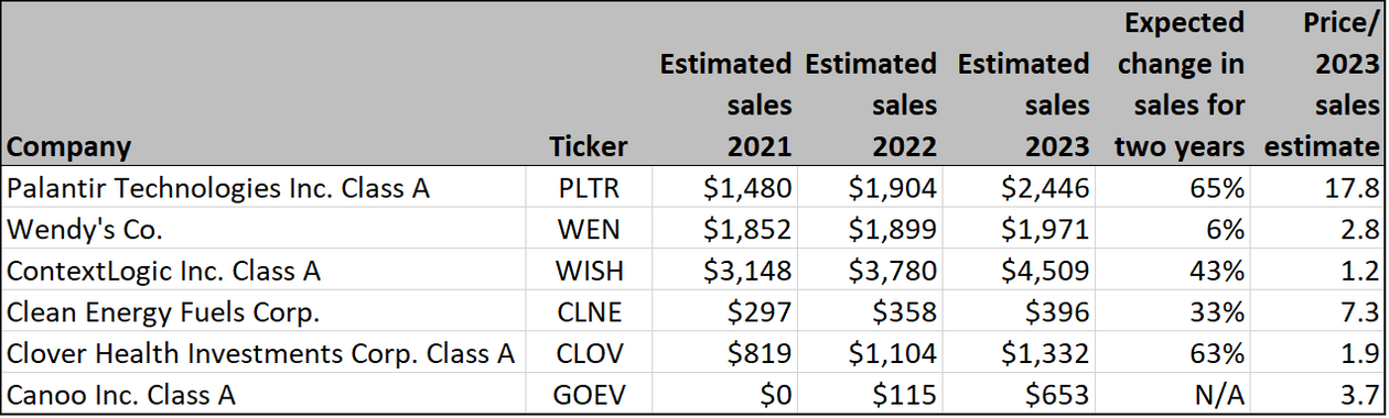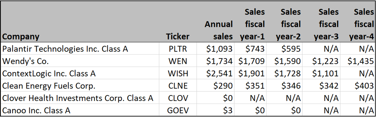 You can see clear growth paths in recent years for Palantir, Wendy's and ContextLogic, while Clean Energy Fuels had understandable challenges from lower natural gas prices in 2020.
