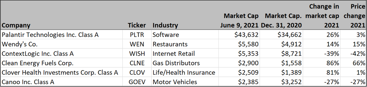 Palantir's stock was up 3% for 2021 through June 9, but its market cap had increased by 26% because the company had been raising cash by selling additional shares to investors. The company's following as a meme stock seems to spring more from its growth prospects than from short interest, which peaked at 8.5% of shares available for sale, according to FactSet.