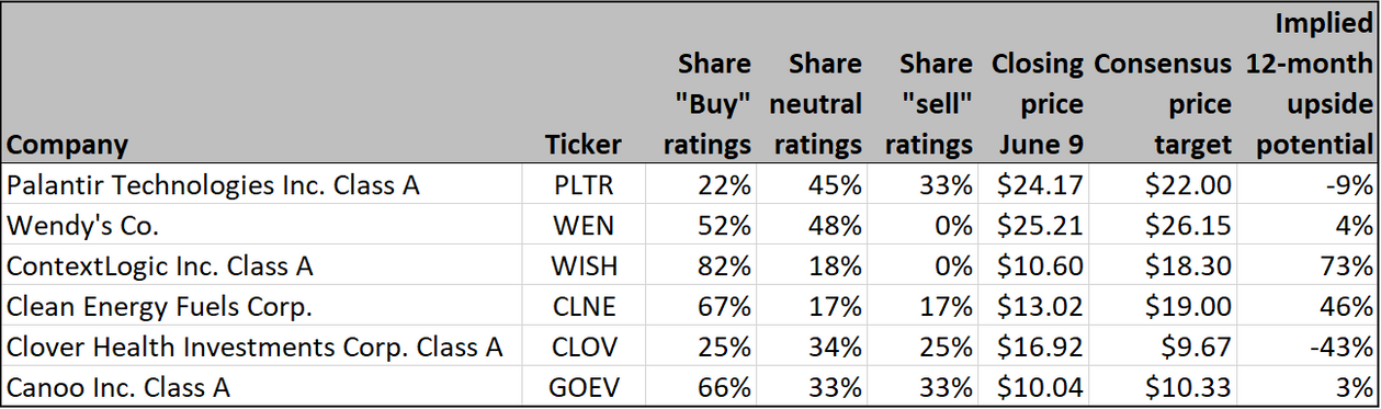 So the Wall Street analysts have the most love for ContextLogic, with 82% "buy" or equivalent ratings. Second place goes to Clean Energy Fuels. For that company, the timing, in a year of economic and fuel-price recovery, not to mention the desire among many investors to help lower carbon emissions, seems perfect.