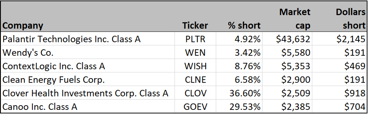 The action changes daily. On June 9, for example, shares of Clover Health Investments Corp. $(CLOV)$ fell 24% after rising 86% the day before. The stock is 36.6% sold short, according to FactSet.