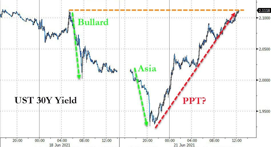 其中,30年期美债收益率V形反弹,亚市早盘曾跌破2.00%至1.929%,连续三个交易日创四个月新低,欧股盘中转升,美股收盘时略高于2.10%,较日内低位升逾10个基点。上周议息会议上,美联储明显上调了今年的通胀预期,虽然重申通胀上升主要来自暂时的因素,但释放了两年后、即2023年有可能加息不止一次的信号。