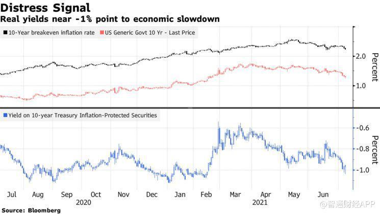 美国国债波动的迹象十分明显,周四,10年期国债收益率自2月份以来首次跌至1.25%以下,而剔除通胀预期的实际收益率已进一步跌至负区间,这是经济复苏停滞的典型指标。十年期通胀盈亏平衡率(市场对未来十年物价预期的预测)跌至3月份以来的最低水平。