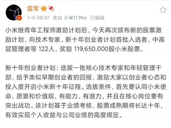 另外,7月初,还有小米创始人雷军两次发布人才奖励计划,前后涉及金额共接近50亿元。