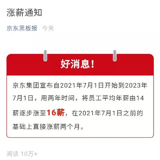 对人才重视,不仅华为,其他企业也舍得掏钱。与此同时,京东发布涨薪通知,将用两年时间把平均年薪由14薪涨至16薪,即在7月1日之前的基础上直接涨薪两个月。