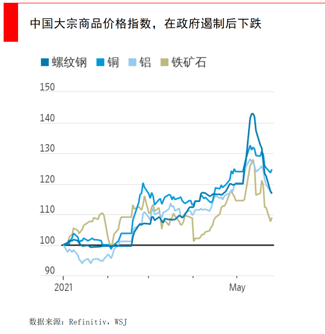 自官方强硬立场以来,中国市场铁矿石、螺纹钢、铝和铜等原材料的价格都有所下降。如果不遏制原材料成本飙升的走势,这些涨价将挤压企业利润,迫使他们将终端产品涨价,最终导致居民消费力下降。这些举措都确保了后疫情时代的整体经济复苏,不会受到原材料价格疯涨的伤害。