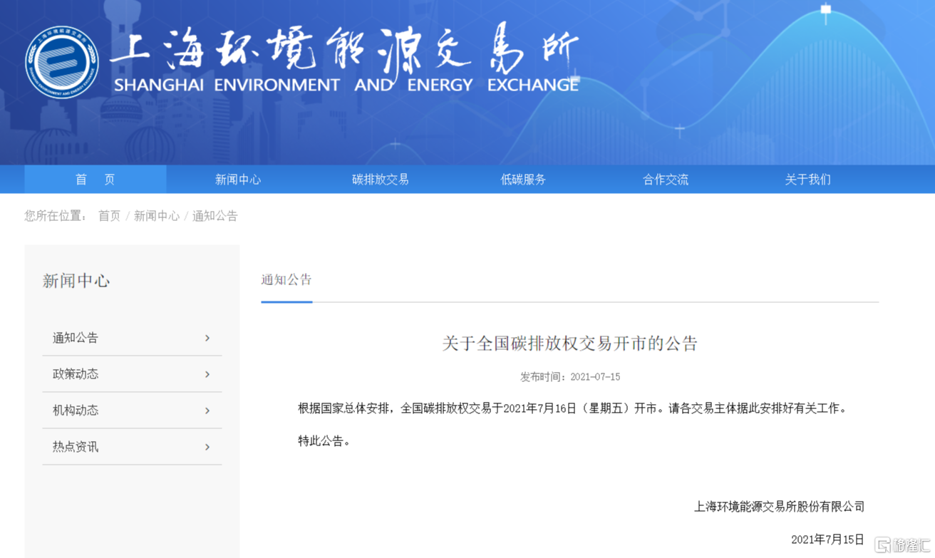 上海环境能源交易所公告称,全国碳排放权交易于2021年7月16日(星期五)开市。