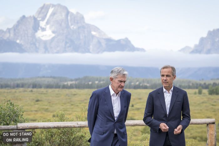 Fed Chairman Jerome Powell, left, and Mark Carney, former governor of the Bank of England, walk the grounds during the last in-person Jackson Hole economic symposium in 2019.