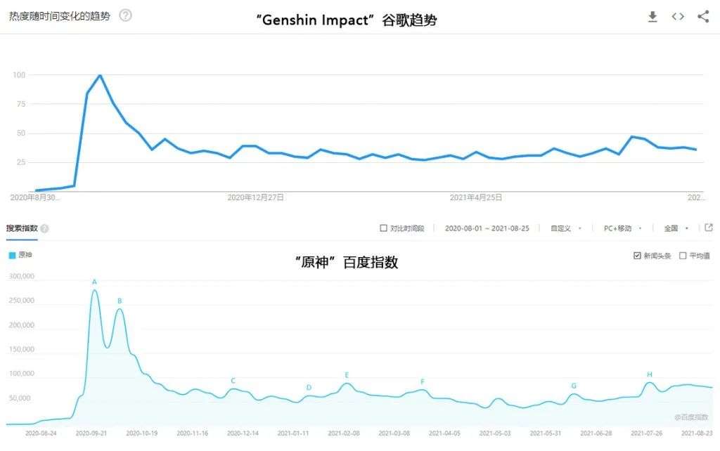 根据百度指数和谷歌趋势,在上线后近一年的时间里, “原神”和“Genshin Impact”的搜索热度一直保持在一个稳定水准,在“原神2.0”更新之时还有小幅上涨,足以见《原神》的热度十分坚挺。