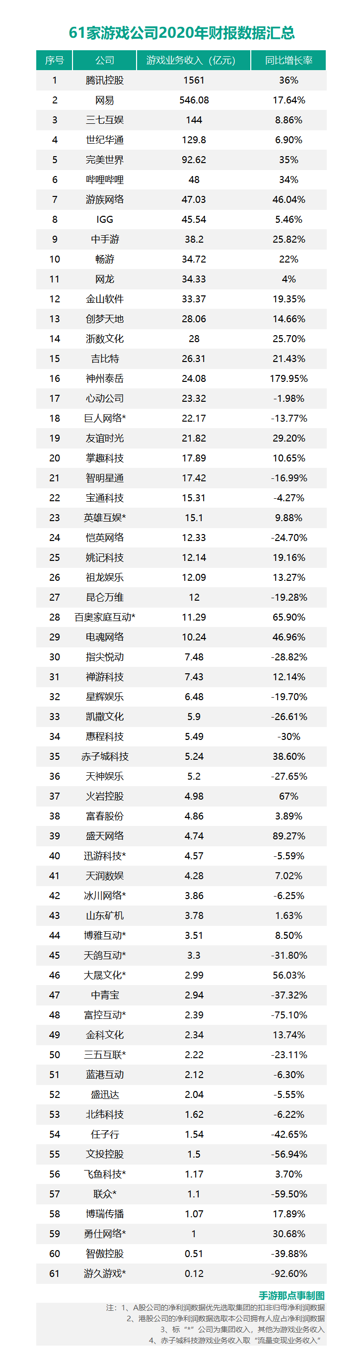 手游那点事曾对国内61家上市游戏公司的2020年财报收入情况进行了统计,在我们的统计中,2020年腾讯游戏业务收入1561亿位列第一;网易以546.08亿位列第二;三七互娱以144亿位列第三;世纪华通以129.8亿位列第四;如今,我们可以将米哈游2020年的101亿收入放在第5。