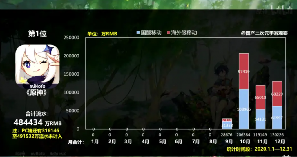 根据B站UP主@国产二次元手游观察之前的统计,2020年《原神》包含PC和PS端的全球流水应该在约80.06亿到97.6亿人民币之间,《崩坏3》流水约为19.77亿,《崩坏学院2》流水约为1.01亿,《未定事件簿》为1.02亿。