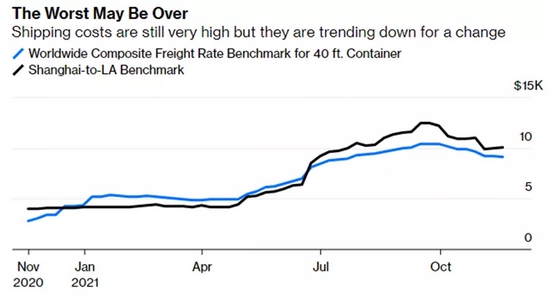 实际上美国通胀的二阶导拐点已经出现。11月CPI环比0.8%,薪资增速环比0.3%,均较上月有所下行。另外海运运费已经连续八周下降,集装箱滞留港口的数量也减少了三分之一。芯片短缺正在缓解,通用汽车和苹果手机均表示交货时间缩短,生产趋于正常。(见图2、3、4、5)