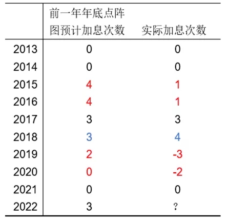 而点阵图“明年三次加息”的预测其实并不牢靠。从历史看,点阵图基于的是联储票委对当时经济和通胀情况的线性外推,与后来实际的货币政策往往大相径庭。2015、2016、2019、2020年都是明显高估了经济和加息次数。(见表1)