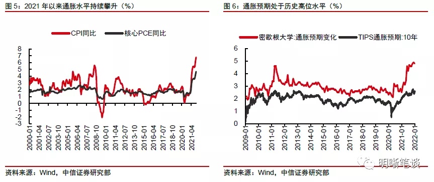 通货膨胀水平逐步攀升,持久性与上升幅度超预期。会议纪要提及“截至10月的消费者物价通胀率仍然居高不下,近几个月通胀压力有所扩大”。2021年以来,供需增速不匹配导致通胀水平急速上升,CPI同比增速从1月1.4%水平上升至11月6.8%,创2000年以来最高值;核心PCE趋势与CPI类似,2020年12月至2021年11月上升3.2%,去年11月同样达到2000年以来最高值,远超过往最高值水平;通胀预期指标自2020年4月保持上升趋势,近期呈现平稳态势。FOMC与会者指出通胀水平比预期更高且高通胀水平比预期更持久、更全面。