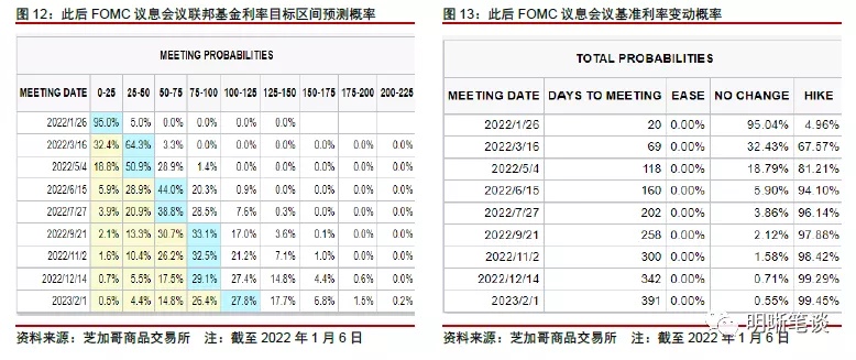 市场对于美联储2022年加息预期有所上升,并对加息时点的预期也大幅提前,该预期变化推动美债利率快速上行。市场对于加息预期升温,根据芝加哥商品交易所的数据,截止2022年1月6日,市场预期2022年12月联邦基金利率目标区间主要集中于50-125bp,而在2021年9月末市场预期该时点利率目标区间主要为0-75bp;市场预期2022年3月加息的概率为67.57%,远超去年九月末市场2.37%的预期。我们认为美联储于2022年第一季度首次加息的可能性较高,美联储2022年或进行三次加息,此外近期市场对于加息预期的增强推动导致10年期国债上升5bp并突破1.7%,我们预计近期利率将进一步快速上行。