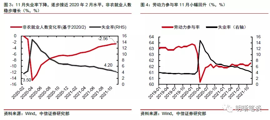 美国劳动力市场复苏态势较为明确,在逐步接近美联储最大就业目标。会议纪要表明劳动力市场状况继续改善,近几个月就业稳定增长,失业率进一步大幅下降,许多与会者认为美国经济在实现最大就业目标方面取得了快速进展,一些与会者认为劳动力市场状况已经在很大程度上与最大就业率相一致。美国失业率从10月4.6%下降至11月4.2%,为2020年2月以来最低值,逐渐接近疫情前水平;美国11月非农就业新增人数虽不及预期,但非农就业总人数自2020年4月以来稳步上升,非农就业总人数11月为1.486亿,比2020年2月水平低391.2万人(2.56%);劳动参与率从10月开始小幅上升至11月61.8%。目前加息的通胀条件已达到,预计最大就业目标最早于2022年第一季度达到,因此加息最早或在2022年第一季度开始。