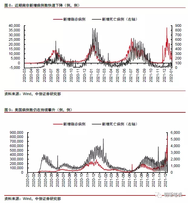 会议纪要表明Omicron毒株增加了经济不确定性,但未从根本上改变美国经济复苏态势。虽然新冠病例和住院人数的激增以及Omicron存在耐药性的风险将对于经济存在冲击。但Omicron变异毒株住院率、重症率较低,同时南非新增病例数快速下降也预示着2022年上半年美国或将迎来疫情减弱期。许多与会人员指出Omicron变体的出现使经济前景更加不确定,但一些与会人员表明他们还没有看到新的变体从根本上改变了美国的经济复苏之路。