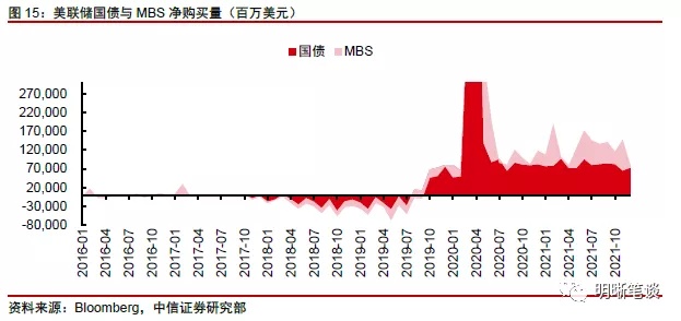 美联储会议纪要首次提及对本轮缩表的讨论,美联储未来紧缩速度超市场预期。纪要表明12月美联储会议首次讨论本轮缩减资产负债表的适当条件和时机,几乎所有与会者都认为在首次上调联邦基金利率目标区间后的某个时间点启动资产负债表决战可能是合适的;与会人员也指出本次缩表需要注意当前经济状况与以往缩表背景存在差异性,而差异性主要体现在当前更良好的经济前景、更高的通胀、更紧张的劳动力市场和更大的资产负债表,因此缩表的步伐可能会加快。此外,与会者指出目前美联储国债持有量的加权平均到期日比上一次缩表开始时更短,因此如果遵循先前缩表的方法,逐步取消对到期国债的再投资和对机构MBS的本金支付,那么也可能会导致资产负债表的缩减速度比上次更快。
