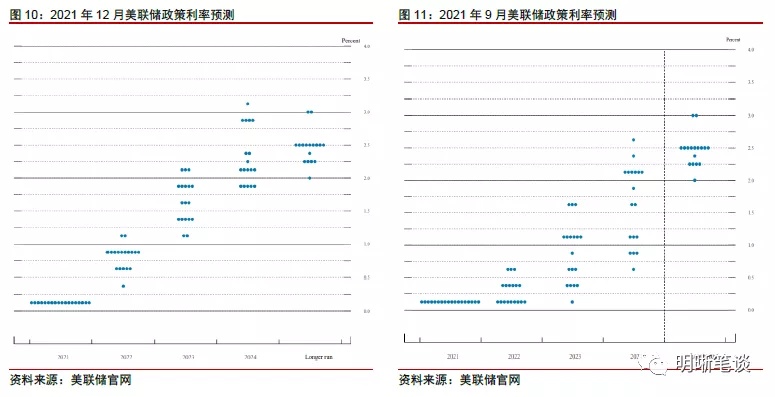 随着经济进一步改善,2022年经济环境或将提早触发美联储加息。12月FOMC会议经济预测方面,美联储下调了2021年和2023年的GDP增长,上调了2022年的GDP增长;较大幅度上调了2021年、2022年的通胀水平;下调了2021年以及2022年失业率。纪要指出通胀上调主要考量因素为住房成本和租金上涨,劳动力短缺导致的全面工资增长以及持续更久的全球供给侧摩擦。同时,纪要指出许多与会者判断,如果目前的改善速度继续下去,劳动力市场将很快接近最大就业。在高通胀、向好且偏紧就业市场、较好的经济增长前景的背景下,美联储或提早加息。