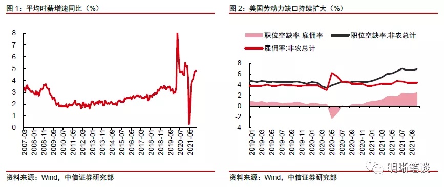 美国面临较严重的劳动力短缺问题以及工资快速增长,就业市场态势偏紧。会议纪要指出接近创纪录的辞职率和职位空缺率,以及工资增长大幅上升的迹象表明美国劳动力市场较为紧张。10月职位空缺数为1103.3万人,为2000年以来次高值,较2020年2月增加了57%,并且10月的职位空缺数比失业人数多415.6万人,职位空缺率与雇佣率差值也进一步扩大,为2015年以来新高。10月离职人数为415.7万人,也处于历史较高水平。美国劳动力市场缺口扩大,公司招工难促使公司提高薪酬以吸引人才,薪酬大幅增长,11月平均每小时工资同比 4.8%,增速处于历史较高位且2021年以来呈现持续上升趋势。