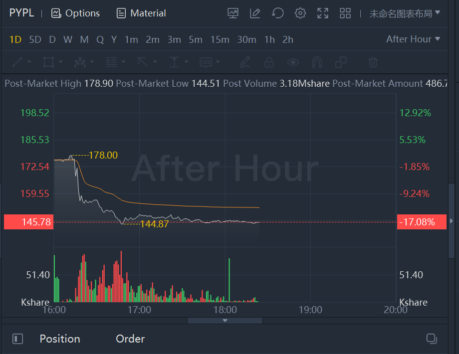 Shares were off 17% in after-hours trading Tuesday as the company's outlook came in light of expectations. For the first half of the year, the company sees continued headwinds from eBay Inc. $(EBAY)$, which has been migrating volume away from PayPal as part of its own payments evolution.