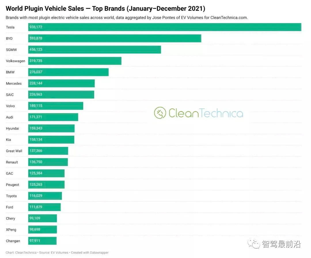其中,中国品牌8家分别为比亚迪、上汽集团、上汽乘用车、长城欧拉、广汽埃安、奇瑞集团、小鹏汽车以及长安汽车。比亚迪以59.39万辆的销量排名第2,实现了超过220%的同比增长,全球市场份额达9.1%。上汽集团以45.61万辆的销量排名第3名。上汽乘用车以22.70万辆的销量排名第7名。长城欧拉以13.74万辆的销量排名第12名。广汽埃安以12.54万辆的销量排名第14名。奇瑞集团以9.91万辆的销量排名第18名。小鹏汽车以9.86万辆的销量排名第19名,小鹏P7车型销量创下历史新高,也是其首次进入年度前20名。长安汽车以9.79万辆的销量排名第20名。