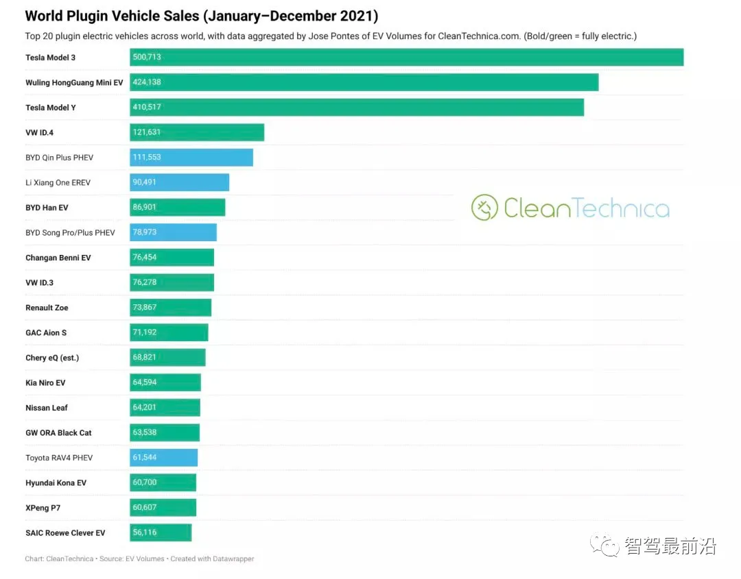 2021年全球新能源品牌销量榜单火热出炉。据CleanTechnica网站公布的2021年全球新能源品牌销量数据显示,2021年全球新能源车型累计销量近650万辆,较去年同期增长108%,其中TOP20品牌销量476.34万辆,占全球销量的73.3%。