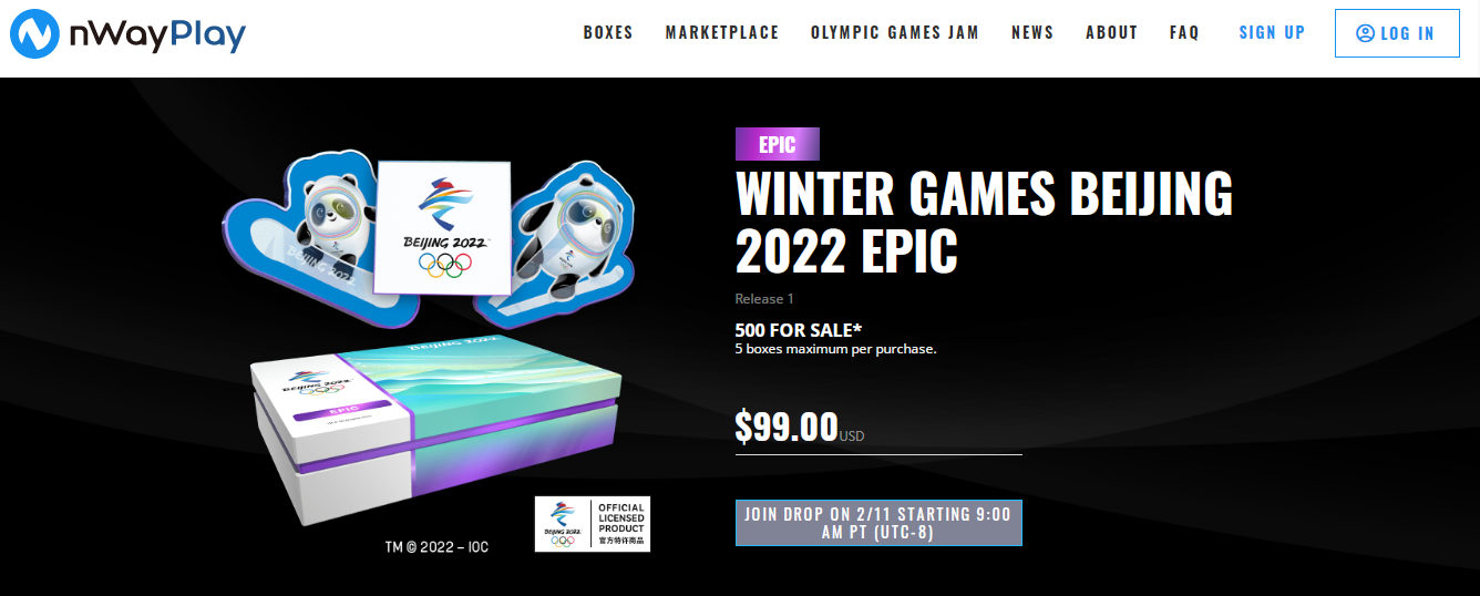 北京时间2月12日1:00,由国际奥委会官方授权的冰墩墩数字盲盒在nWayPlay平台发售,总数为500个,每个99美元,每人限购5个。