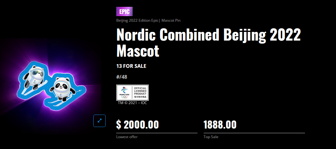 以涨幅较大的北欧联合北京2022吉祥物别针为例,目前共有13个NFT在售,最低报价已达2000美元,最高报价88888美元。