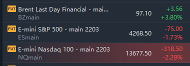 Brent crude futures rose 3.8% to $97.10, just off their overnight seven year high. S&P 500 futures fell 1.73% and Nasdaq futures fell 2.28%. Asian stocks were also down over half a percent, while Japan's Nikkei skidded sharply.
