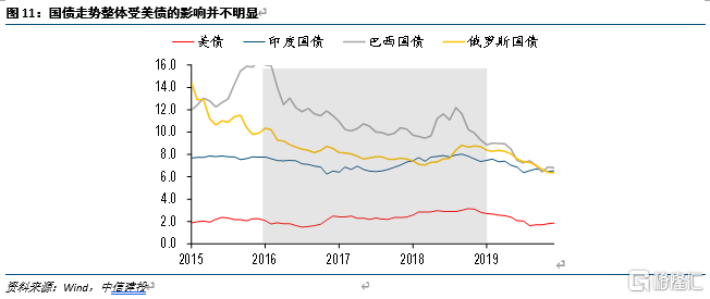 利率整体走低,与美债分化。除了印度国债利率从2017年开始走高外,其余时间三国的国债利率整体以下行为主,且与美债利率的走势一致性不高。美债利率自2016年中开始震荡上行,但随后一年半巴西和俄罗斯债券收益率仍趋势性下行,印度上行幅度也不算高。