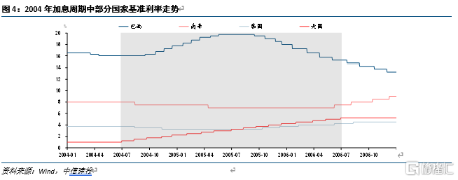 本轮美国加息的早期,南非和韩国均选择了两次小幅降息进行试探,但持续时间并不长。南非在2004年-2005年,基准利率从8%降至7%。韩国由于经济走势低迷,消费不振,大宗商品价格上涨带来GDP增长压力,而CPI保持温和,同样在2004-2005年降息50个bp至3.25%。2006年两国相继结束降息操作,转而开始加息。巴西情况恰好相反,2004年巴西顺应美国加息周期,连续调高基准利率。2005年底,为缓解政府债务压力,应对经济持续下行,巴西开始连续降息,基准利率从20%降至15%。