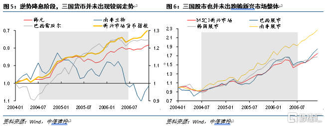 2004年美国加息周期中,新兴市场货币和股市未出现趋势性下行趋势,而是整体向上,甚至大规模的调整都没有看到。初期选择逆势降息的韩国和南非,货币走势不输新兴市场整体,倒是后期降息时南非兰特反而大幅走低。后期降息的巴西雷亚尔也出现了止跌修复的行情,在其之前的加息过程中,汇率走势反而很差。股市也有类似的情况出现,整个加息周期中,三国股市整体均跑赢新兴市场整体。
