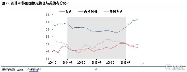 南非和韩国在逆势降息阶段,国债表现并不差。另一个大家更为关心的话题,则是债市如何表现。以南非和韩国为例,二者均在美国加息的前半段进行逆势操作。这一阶段,首先美债整体较为平稳,加息落地后大幅上冲不明显。其次,韩国和南非国债收益率均明显下行,幅度均在100个bp以上。因此,国债的走势这个阶段仍整体由国内货币政策决定。