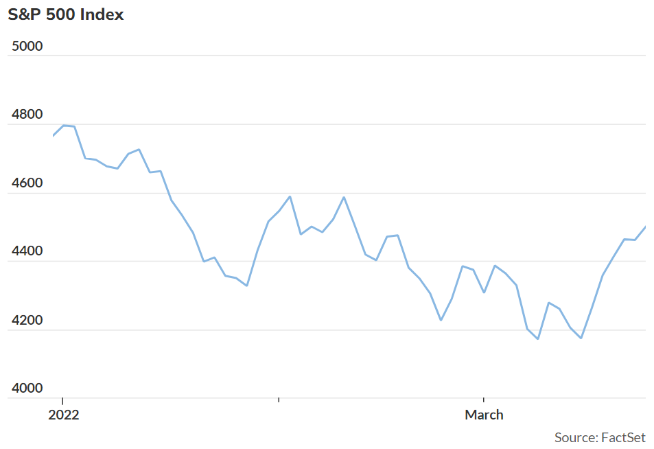 However, stocks have bounced significantly since the Fed last week kicked off the rate-hike cycle with a 25 basis point increase to the fed-funds rate and signaled substantial monetary tightening is yet to come. Stock indexes are now also trading above levels seen ahead of Russia's Feb. 24 invasion of Ukraine.