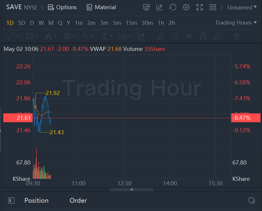 Spirit Airlines stock slumped 8.47% in morning trading.