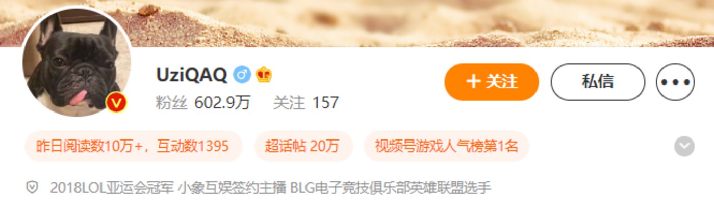 不过,在休养生息一年后,去年12月UZI宣布加入BLG站队,宣布复出。而BLG站队,全称“Bilibili Gaming”,成立于2017年。另外,在今年4月底,UZI微博关注了B站下面的MCN机构“猫爪互娱”。