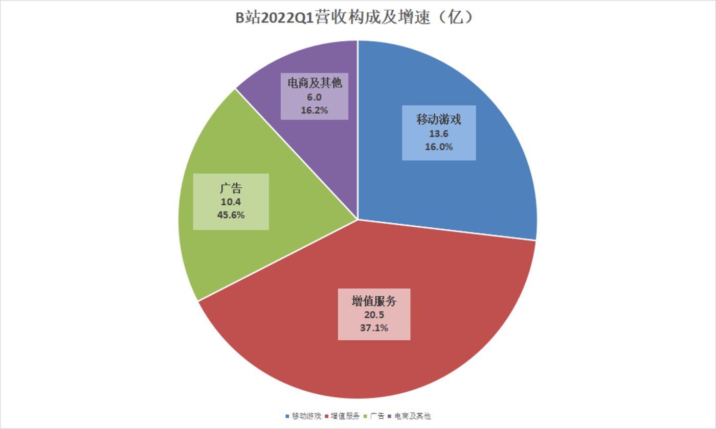 从营收组成具体来看,以直播和大会员付费为主的增值服务(20.5亿)继续超过移动游戏(13.6亿)成为第一大营收来源,增速仅次于广告。