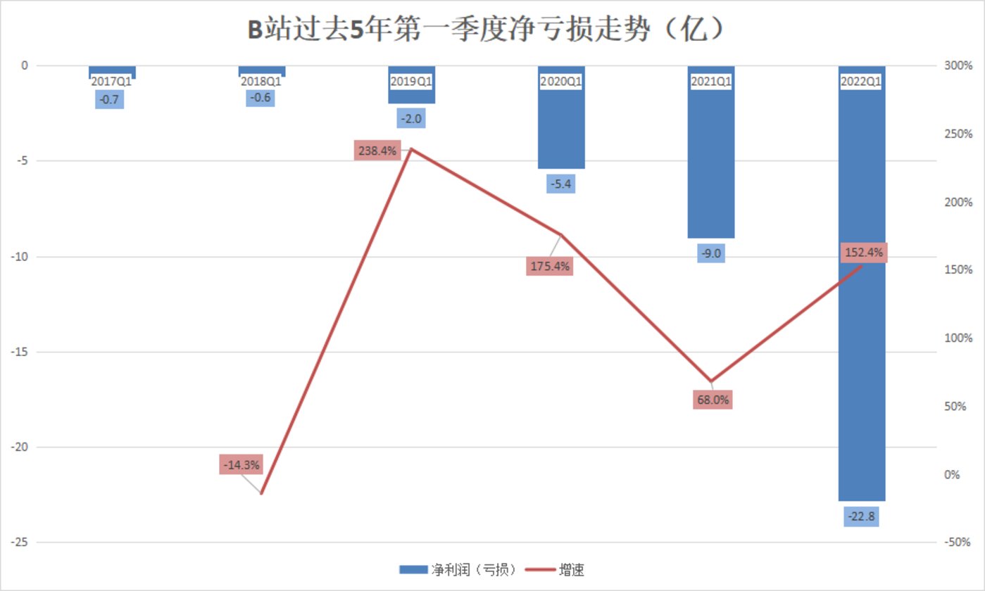 自2017年公布财报数据以来,B站从未实现盈利,而且亏损还在扩大。今年一季度净亏损达到22.8亿,去年同期为9亿,同比扩大152%。
