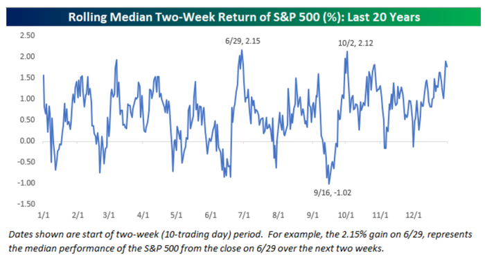 The S&P 500 historically performs well during the two weeks following the close on June 29, with its 2.15% gain over that stretch being “the best of any other day on the calendar over the last 20 years,” the note shows. The trend is captured in this chart below.