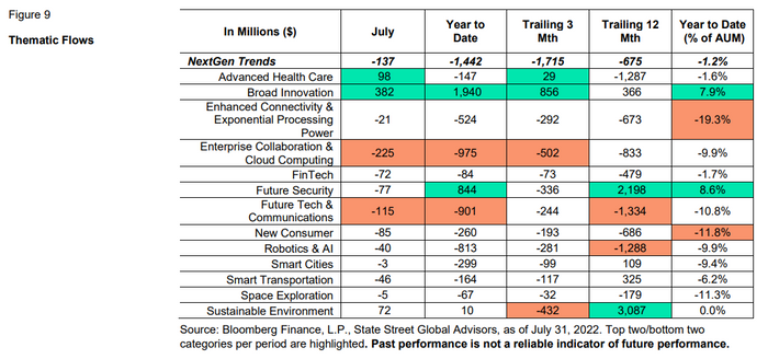 Thematic ETFs, which invest in "NextGen" trends, had outflows in July in all but two of the 13 sectors broken out by State Street under the category. Investors added capital to broad innovation and advanced healthcare themes, also the only two areas with inflows over the trailing three months, the report shows.