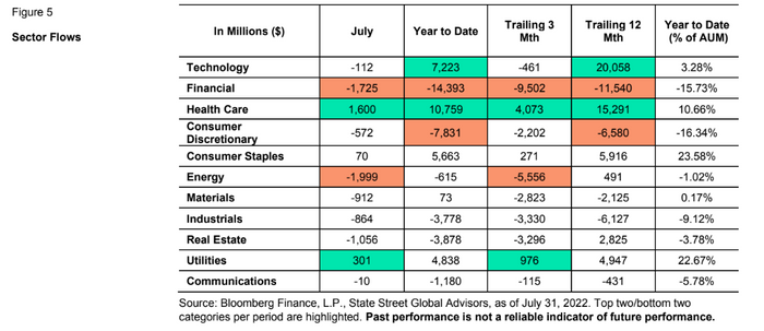Meanwhile, investors last month contributed to ETFs focused on traditionally defensive sectors of the stock market: healthcare, consumer staples and utilities, according to State Street. But sector funds overall saw a net $5 billion of outflows in July, with investors pulling capital from the category for a third straight month.