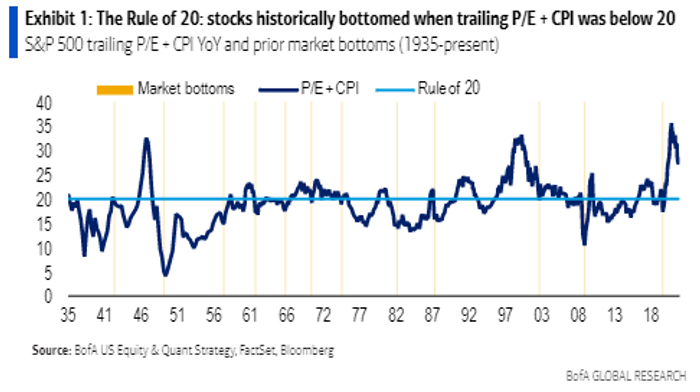 One of these signposts in particular is essential -- the Rule of 20. That is when the sum of yearly consumer price inflation and the market's trailing price-to-earnings ratio is lower than 20 when the market hits its trough.
