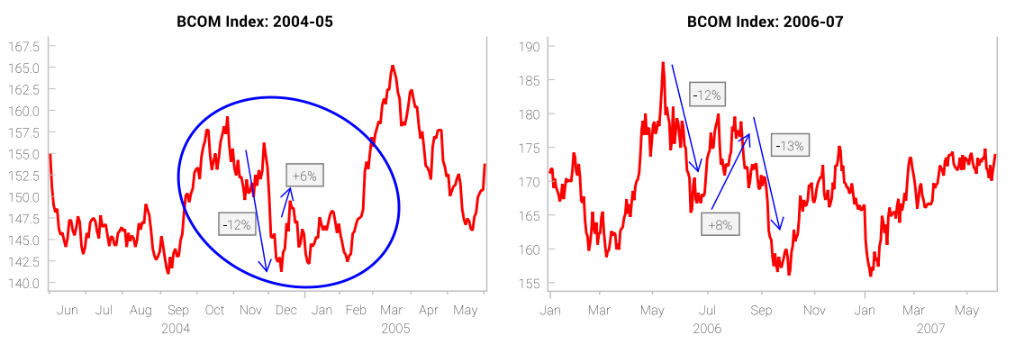 投资研究公司 Variant Perception 的观点认为,当下正处在商品超级周期的“间歇”,2022年下半年大宗商品走势整体会呈现“大幅波动、小幅指向偏差”。该机构认为,当下大宗商品价格走势与将04年第四季度、06年下半年的走势较为类似。