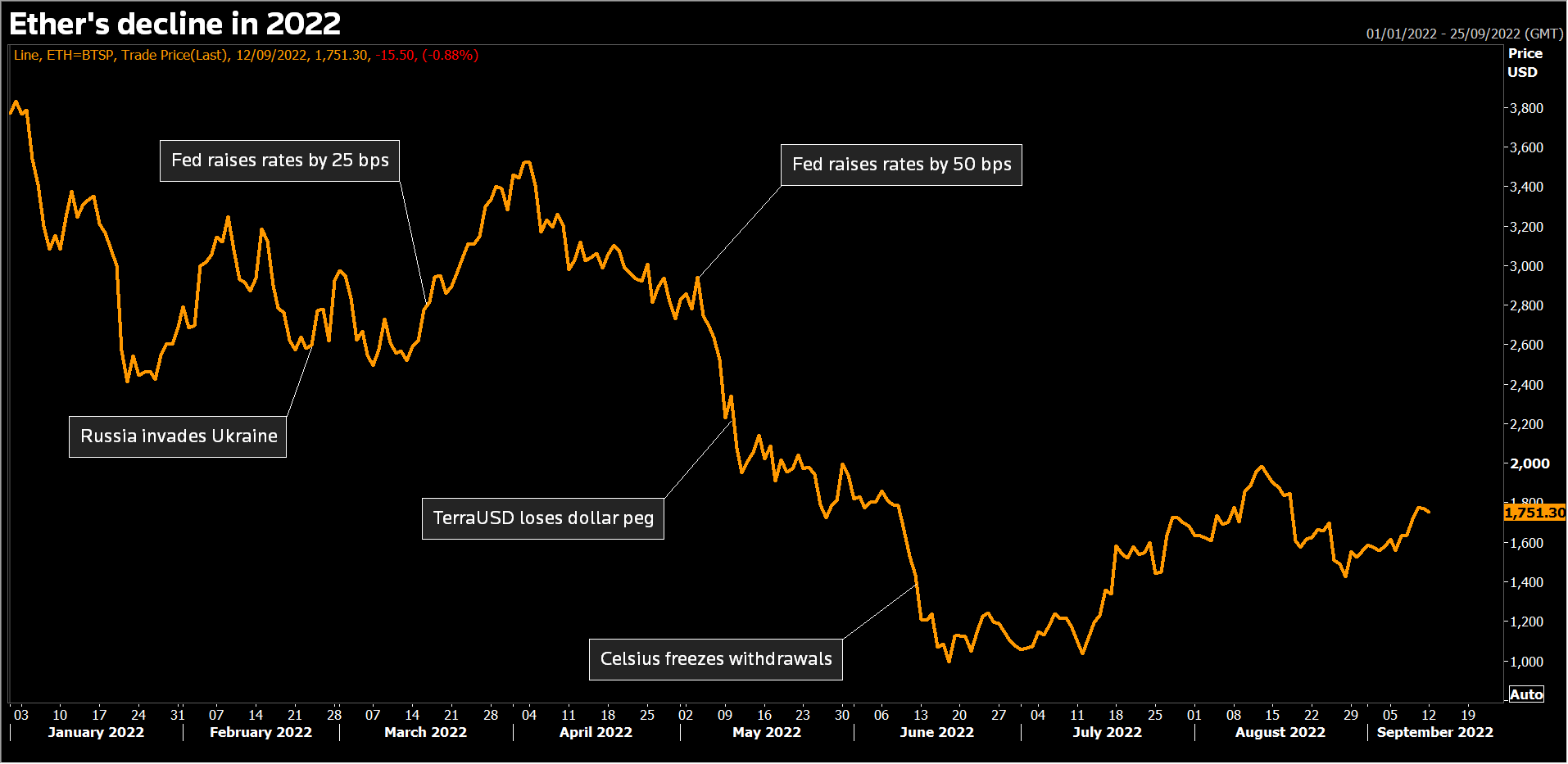 Crypto prices plunged earlier this year as a broader downturn in financial markets prompted investors to ditch risky assets. Ether has risen around 65% since the end of June ahead of the Merge, while bitcoin has seen little change .