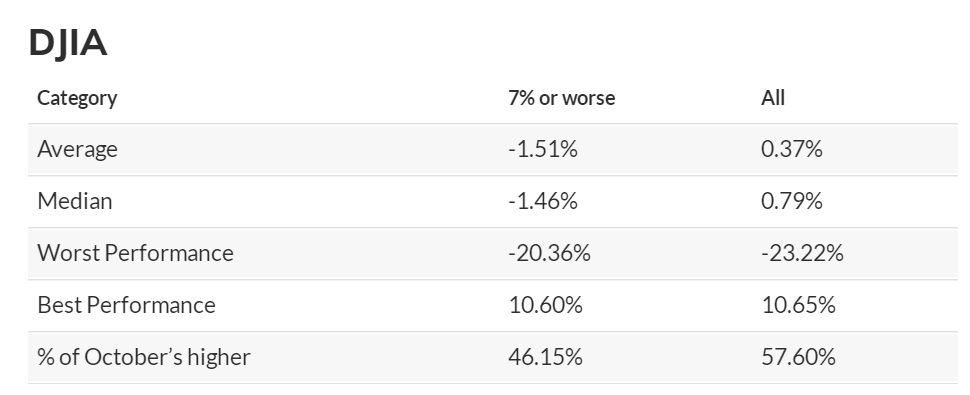 Dow Jones Market Data found that in Octobers following a September drop of 7% or more, the Dow has seen an average fall of 1.51% and a median drop of 1.46%. That compares with an average rise of 0.37% for all Octobers and a median gain of 0.79%. The S&P 500 has risen 46.15% of the time in Octobers that follow a 7% or more September decline, versus a rise 57.6% of the time for all Octobers (see table below).