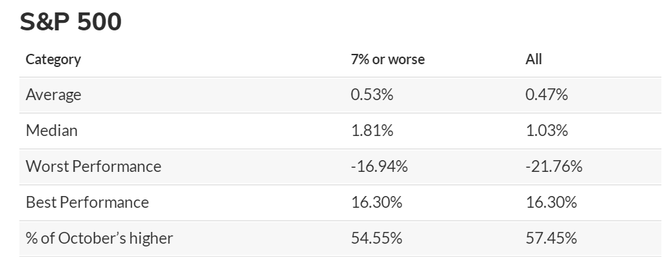 Dow Jones Market Data found that in Octobers that follow a 7% or larger fall in September, the S&P 500 rises 0.53% on average in October and sees a median gain of 1.81%. That's better than the average for all Octobers at 0.47% and the median at 1.03%. October is positive in years following an outsize September loss 54.55% of the time, versus 57.45% for all Octobers (see table below).