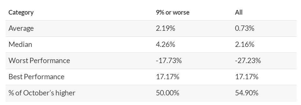 And here are the numbers for the Nasdaq in October following a September drop of 9% or more: