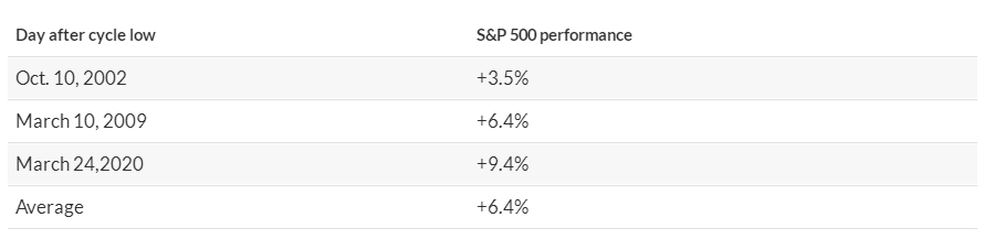 In the past, when long-term bottoms have arrived, stocks have typically greeted them with a large intraday move of at least 3.5%. This held true for the cycle lows that arrived in October 2002, March 2009 and March 2020.