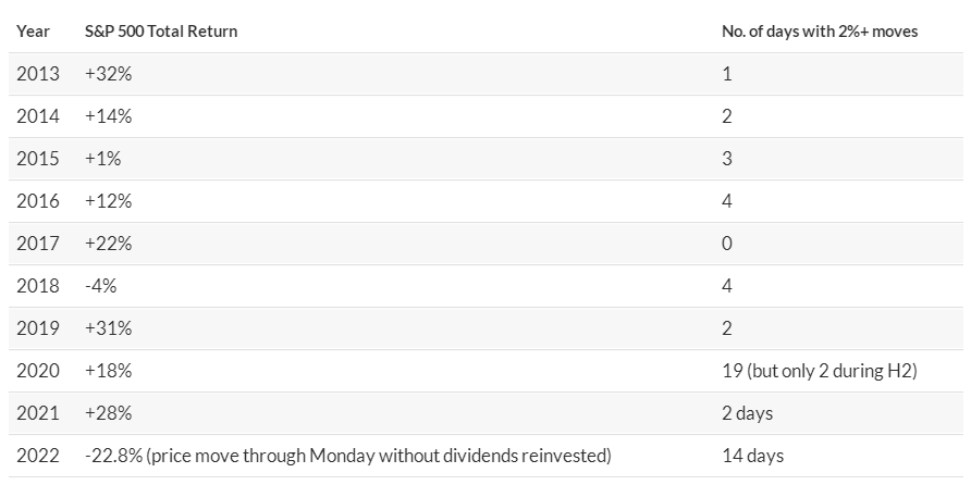 While they have been extremely common since the start of 2022, historically speaking, single-session advances of 2% or more are a relative rarity for markets. Since 2013, years that contained fewer single-day advances of 2% or more tended to result in stronger performance over the course of the year, Colas said.